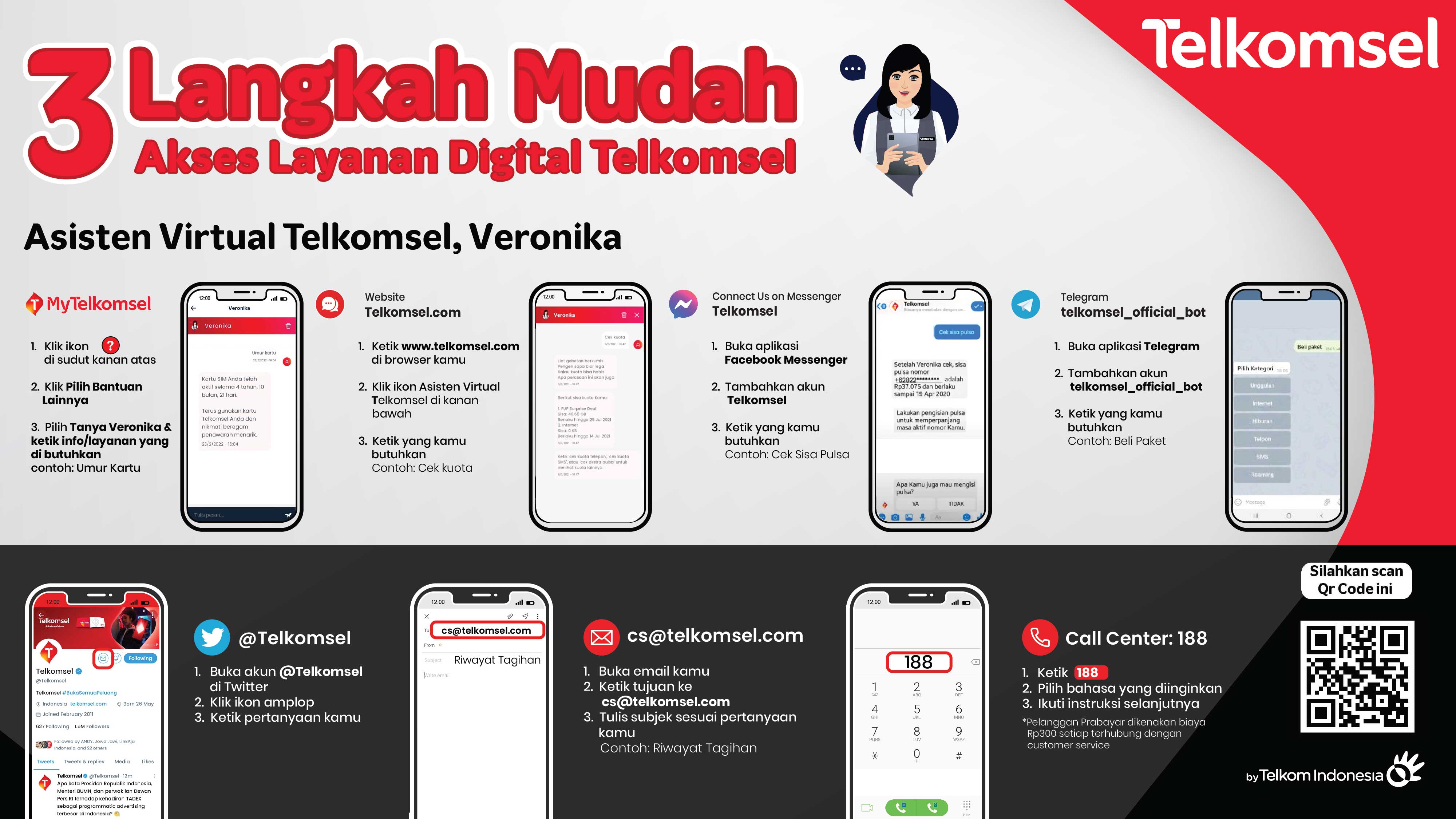 Buat kamu yang mau dapat informasi lebih lanjut mengenai layanan pelanggan Telkomsel, ada beberapa channel yang bisa kamu akses juga selain layanan asisten virtual Veronika. Kamu dapat menghubungi call center 24 jam di 188, GraPARI terdekat, email , juga akun media sosial Facebook fan page Telkomsel, Twitter @telkomsel, dan Instagram @telkomsel.