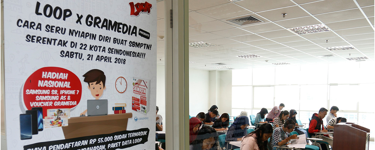 Jakarta, 21 April 2018 - Sukses dengan kolaborasi pertama di tahun lalu, LOOP dan Gramedia kembali bekerjasama untuk mengadakan simulasi SBMPTN (Seleksi Bersama Masuk Perguruan Tinggi Negeri) lanjutan serentak se-Indonesia pada tanggal 21 April 2018. Simulasi yang dilakukan di 22 kota ini meliputi Aceh, Medan, Pekanbaru, Palembang, Lampung, Jakarta, Bogor, Cirebon, Bandung, Semarang, Purwokerto, Yogyakarta, Solo, Surabaya, Malang, Bali, Lombok, Banjarmasin, Samarinda, Manado, Makasar, dan Jayapura.