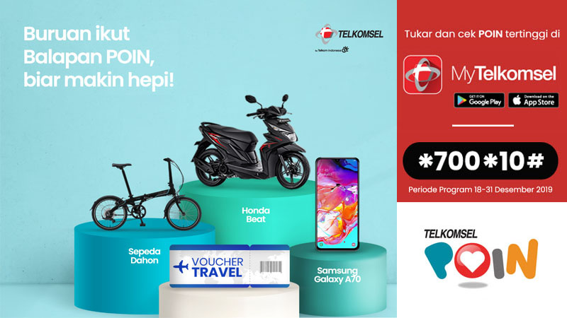 Tukarkan Telkomsel POIN Anda sebanyak-banyaknya untuk memenangkan Sepeda Dahon, Motor Honda Beat, Samsung Galaxy A70, dan Tiket Traveling. Pemenang adalah penukar POIN terbanyak!