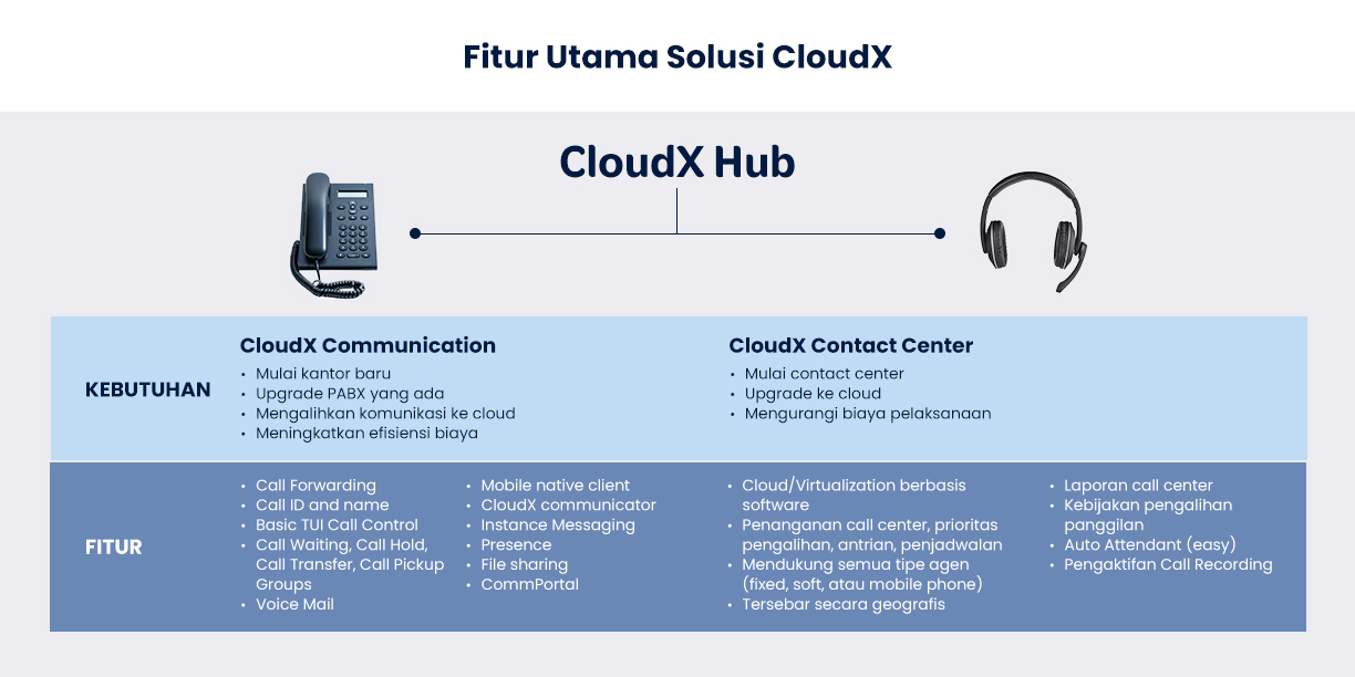 CloudX Hub provides communication services with PABX features that emphasize call center functions to be operated within the Telkomsel Cloud, so customers don't need to have their own PABX infrastructure.