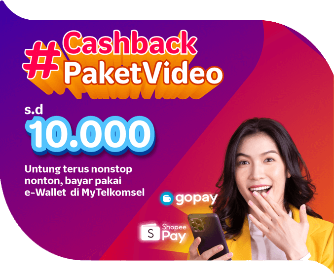 Buy Video packages via MyTelkomsel App worth at least Rp39,000 using GoPay or ShopeePay and enjoy special cashback during the promo program. Cashback is valid for packages under “Entertainment” menu such as Promo Package, Disney+ Hotstar, Prime Video, GALA, GIGAMAX, Vidio, WeTv, VIU, Zee, Vision+, HBO GO, CATCHPLAY+.