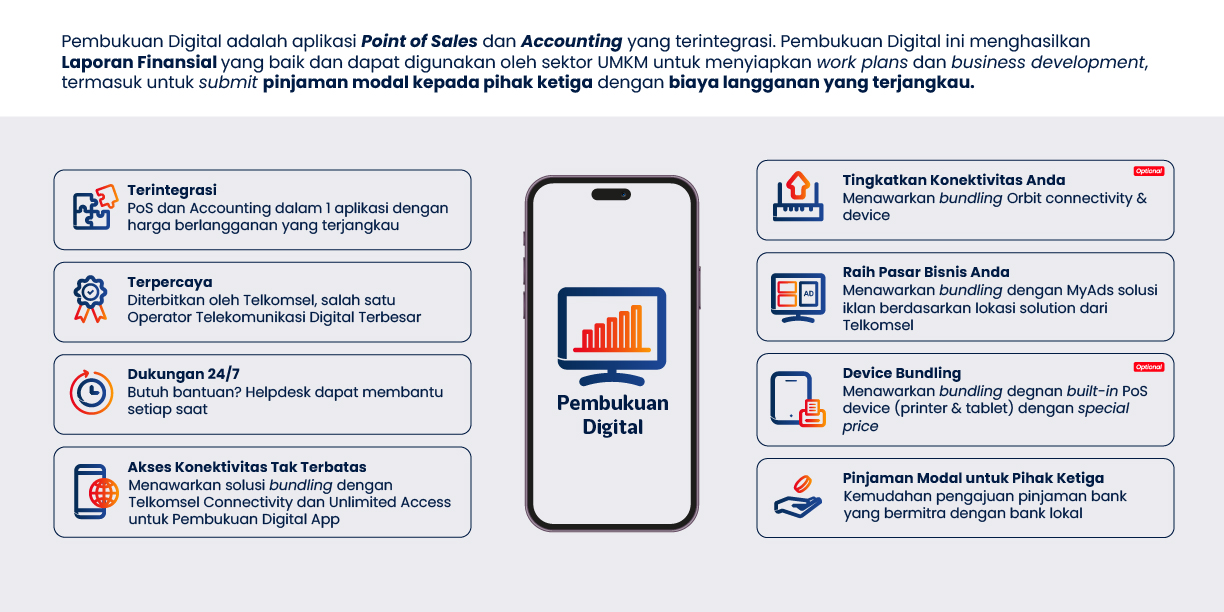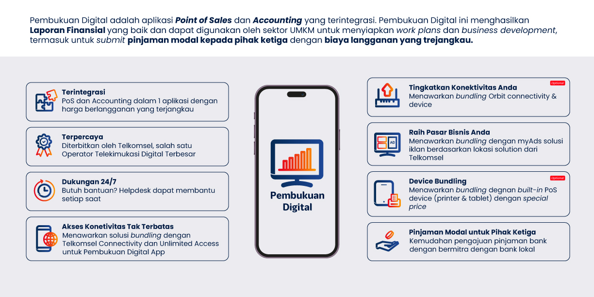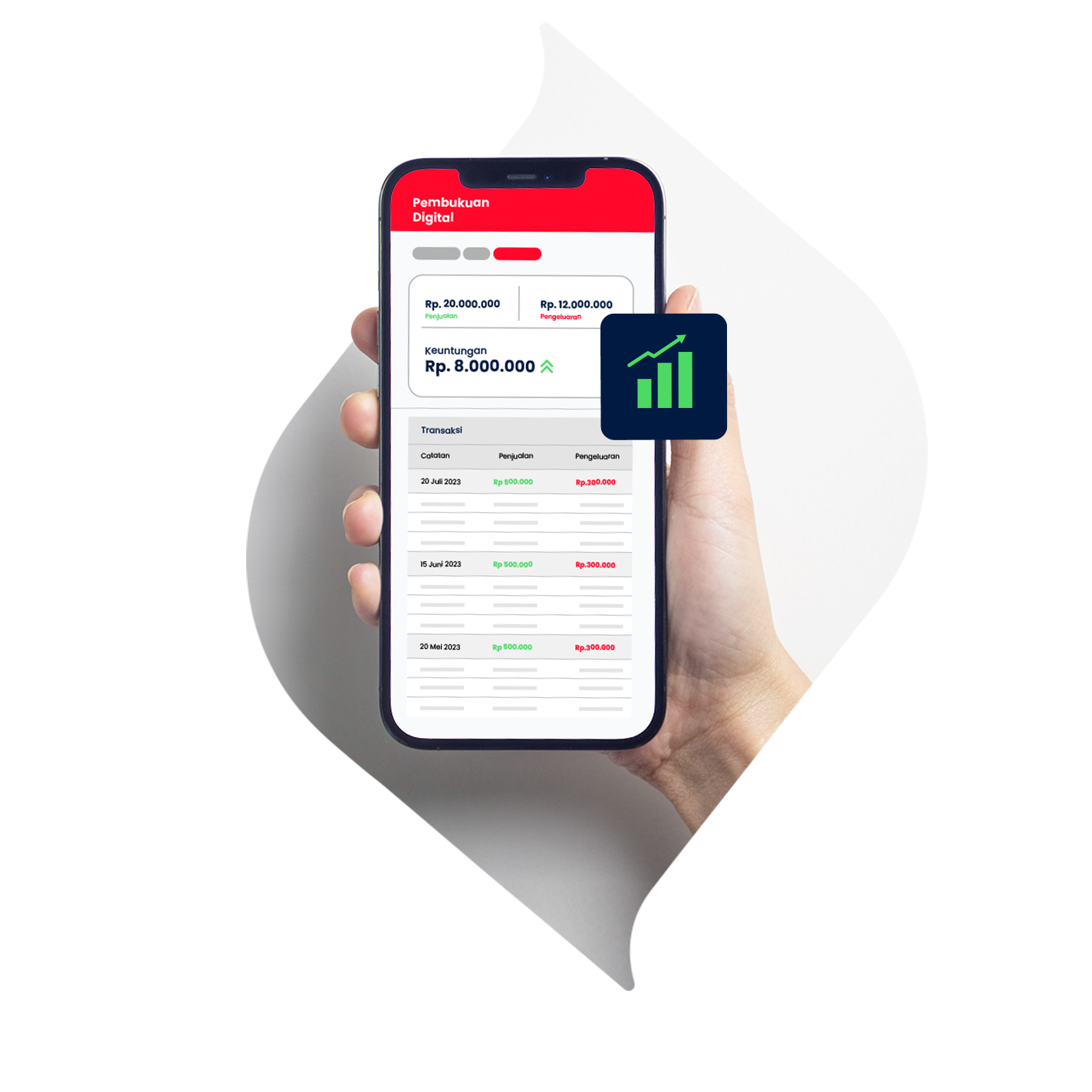 Pembukuan Digital adalah aplikasi penyedia solusi akuntansi yang terintegrasi dengan Point of Sales. Aplikasi ini dapat digunakan sebagai solusi untuk usaha mikro dan kecil. Dengan satu perangkat, Anda dapat mengendalikan arus uang dan penjualan.