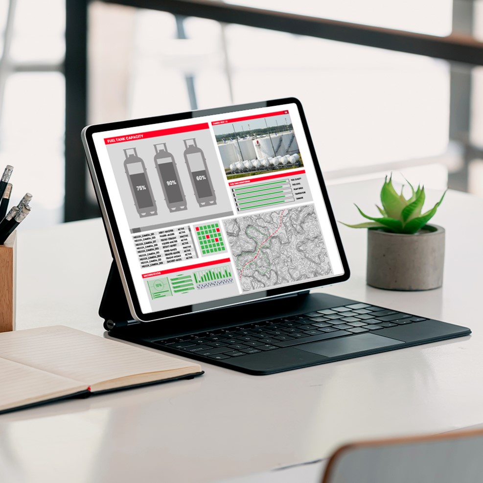 Monitor penyimpanan bahan bakar dan distribusi ke area tambang secara real-time.
