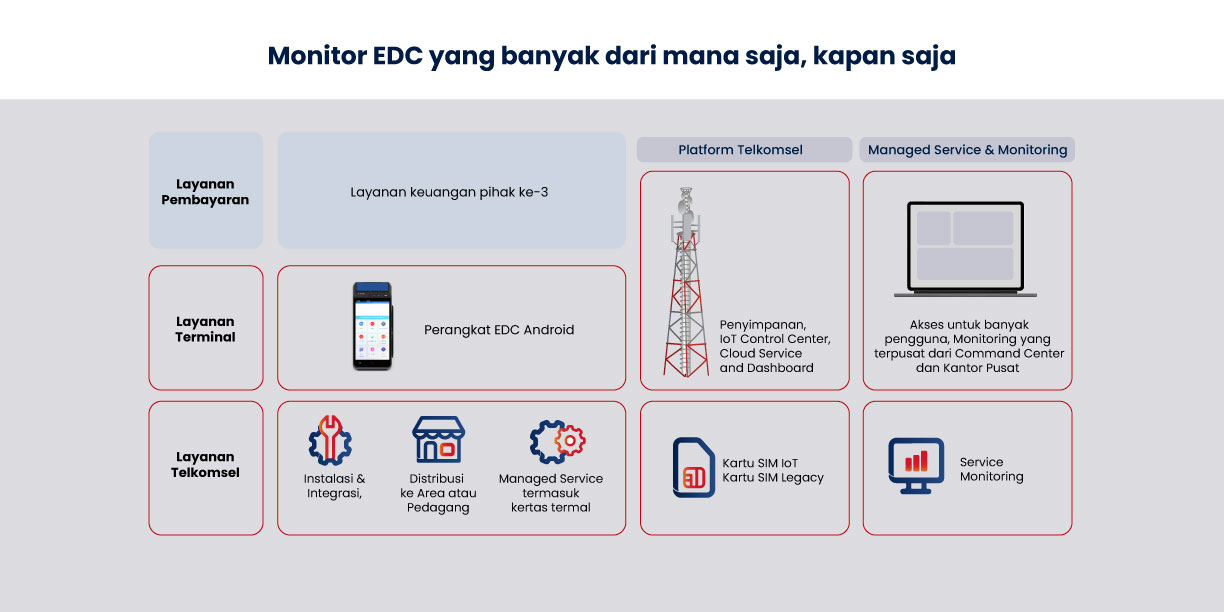 Solusi IoT Managed EDC merupakan layanan dari Telkomsel untuk pelanggan korporat dalam mengelola dan memelihara mesin EDC, konektivitas, layanan terminal, integrasi, dan pemantauan yang menyeluruh dengan bisnis model biaya bulanan.