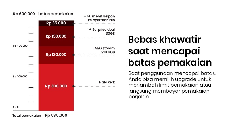 Beralih ke Telkomsel Halo dengan paket Halo⁺ dapatkan layanan serba plus mulai dari kuota internet hingga 350GB di semua jaringan, telepon dan SMS ke semua operator serta roaming. Dapatkan juga beragam hiburan premium hingga ekstra kuota yang dapat dipilih tanpa tambahan biaya. Nikmati mudahnya atur penggunaan, ganti paket, bayar, dan kontrol tagihan dalam genggaman.