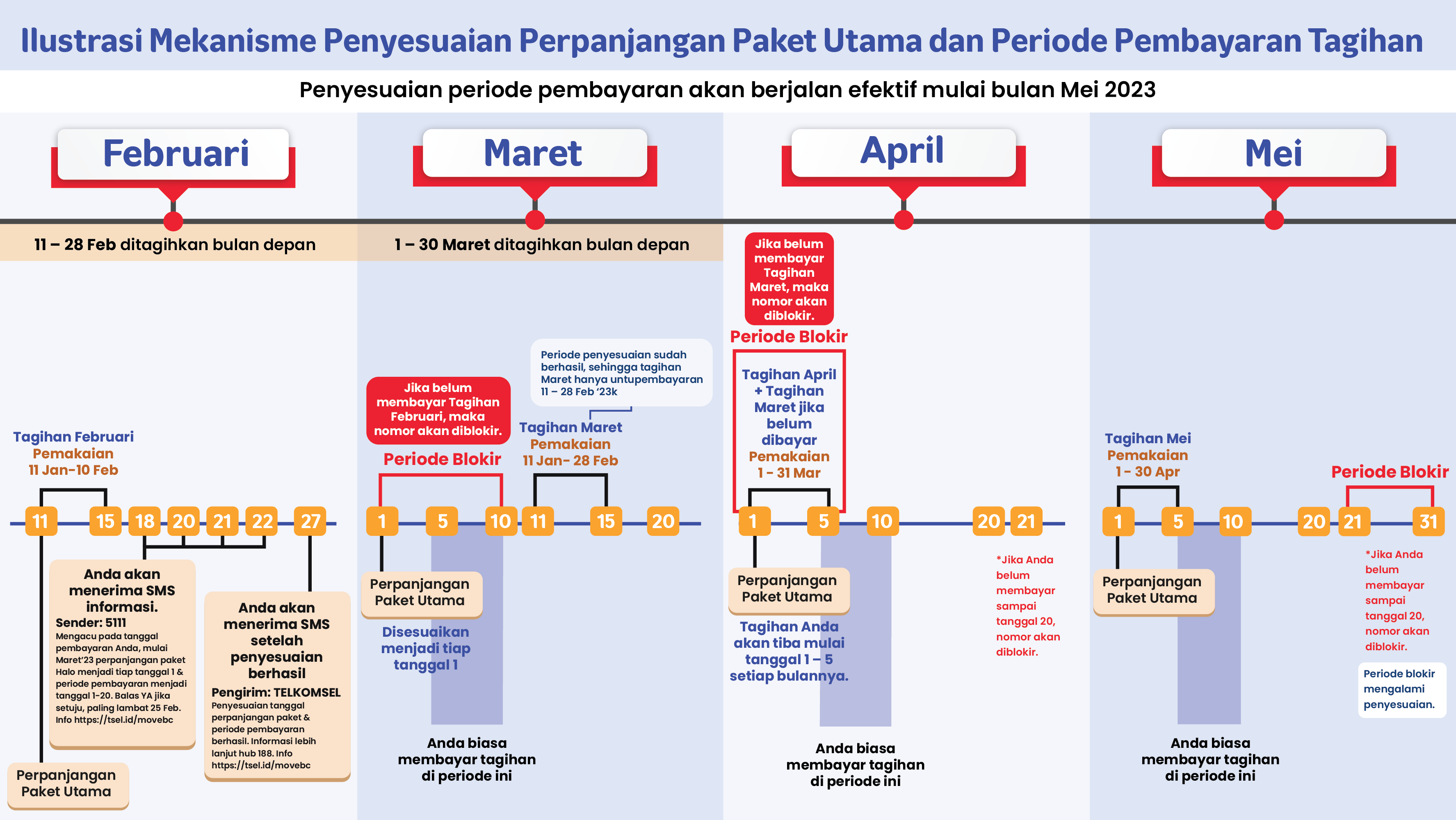 Saat ini sedang dilakukan penyesuaian waktu perpanjangan paket Halo, penerimaan tagihan, periode pembayaran, dan pemblokiran. Penyesuaian efektif secara bertahap mulai 1 Februari 2023, silakan membaca penjelasan pada laman ini hingga tuntas.