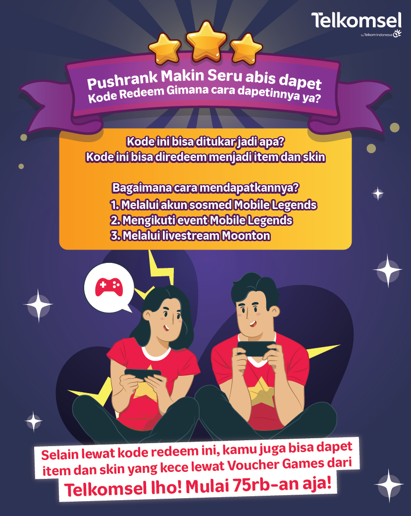 Itu dia guys, beberapa cara buat mendapatkan kode redeem ML. Eits, selain itu, kamu tetep bisa kok dapat skin atau weapon keren lainnya di Mobile Legends dengan menggunakan voucher games dari Telkomsel.