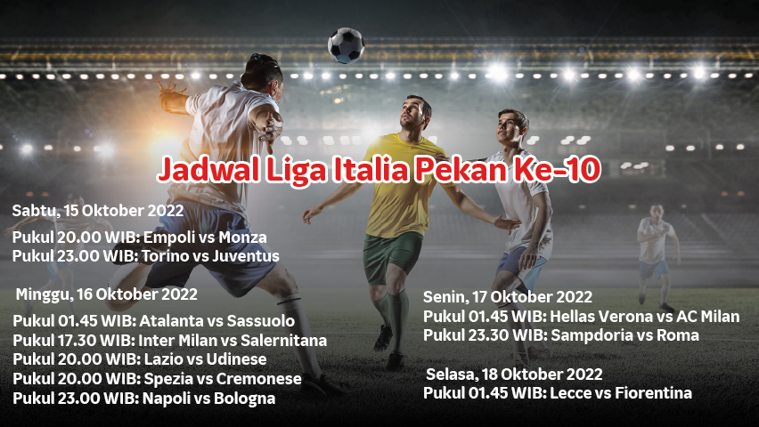 Di pertandingan pekan ke-10 Liga Italia Serie A ini tidak ada Big Match, tapi ada Derby Turin antara Juventus dan Torino yang wajib kamu saksikan! Siapa ya yang akan menang di pertandingan hari Sabtu, 15 Oktober 2022 pukul 23.00 WIB ini? Catat tanggal dan jam dari masing-masing pertandingannya supaya tidak ketinggalan nonton Serie A pekan nanti, ya!