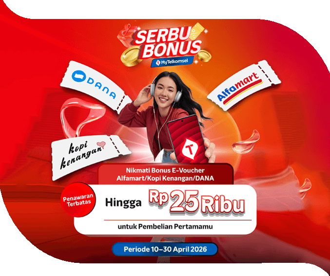 Promo spesial bagi pelanggan yang melakukan pembelian paket pertama kali di aplikasi MyTelkomsel. Cukup beli paket minimum Rp25.000* dan raih kesempatan mendapatkan bonus e‑voucher.