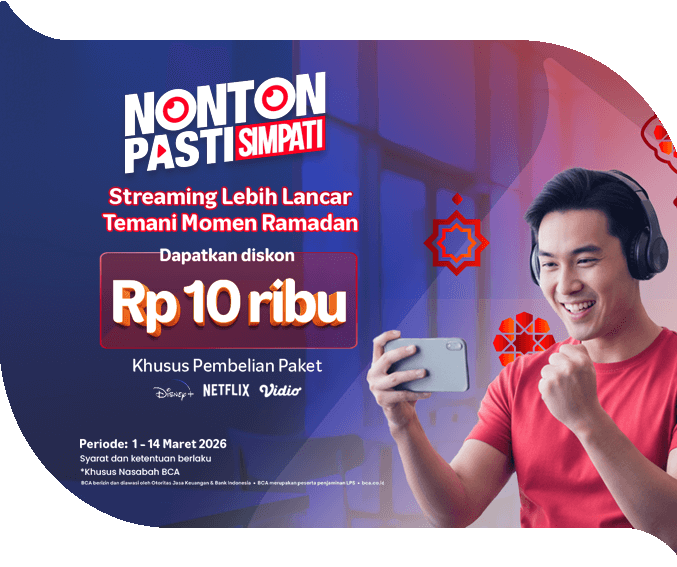 Aktifkan paket video favorit seperti Netflix Mobile, Disney+, dan Vidio Ultimate Mobile via MyBCA atau BCA Mobile dengan diskon spesial Ramadan!