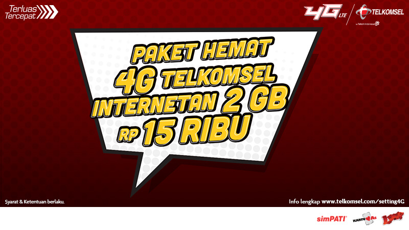 Hanya dengan Rp 15.000, Bisa internetan 2GB selama sebulan. Pastikan jaringan & slot simcard Anda berada di jaringan 4G Telkomsel